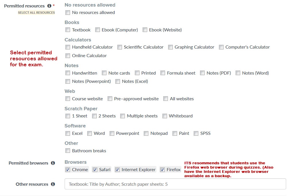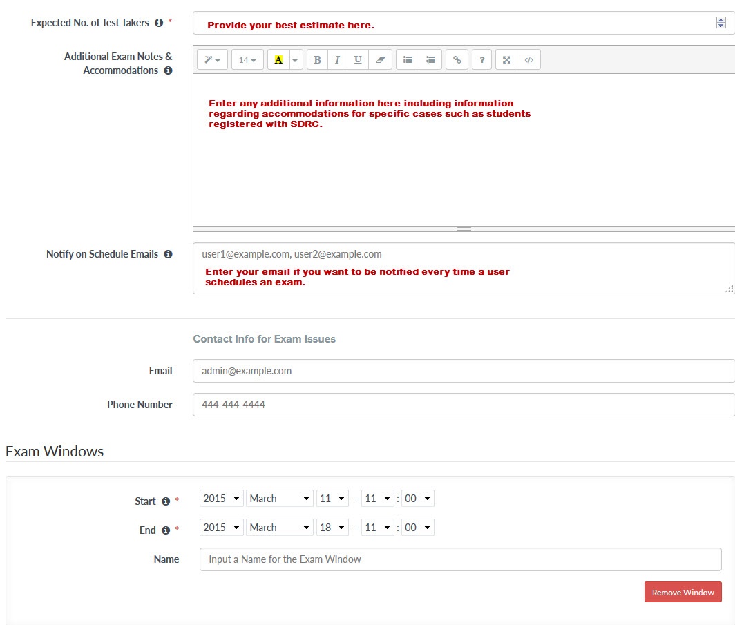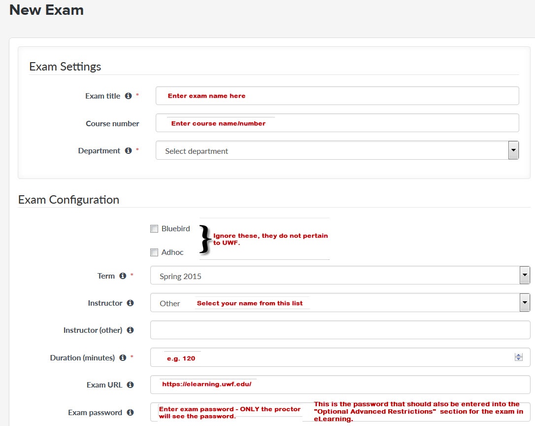 2. Enter exam details including title, course name/number, password, duration and exam window as shown below.