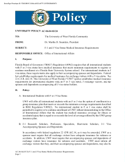 | Abstract | Florida Board of Governors (“BOG”) Regulation 6.009(2) requires that all international students with F or J visa status have medical insurance that meets minimum requirements to register or continue enrollment at a Florida State University System school. For international students in J visa status, these requirements also apply to their accompanying spouses and dependents. Federal law establishes requirements for medical insurance for exchange visitors with a J visa status. See 22 C.F.R. §62.14. This University of West Florida (“UWF”) policy establishes medical insurance requirements for international students with an F or J visa status, J exchange visitors, and the spouses and dependents accompanying all J visa status holders. |