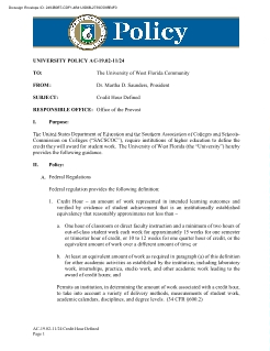 | Abstract | The United States Department of Education and the Southern Association of Colleges and Schools- Commission on Colleges (“SACSCOC”), require institutions of higher education to define the credit they will award for student work. The University of West Florida (the “University”) hereby provides the following guidance. |