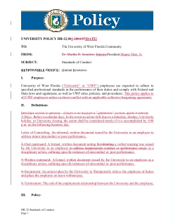 | Abstract | University of West Florida (“University” or “UWF”) employees are expected to adhere to specified professional standards in the performance of their duties and comply with Federal and State laws and regulations, as well as UWF rules, policies, and procedures. This policy applies to all UWF employees unless in direct conflict with an applicable collective bargaining agreement. |