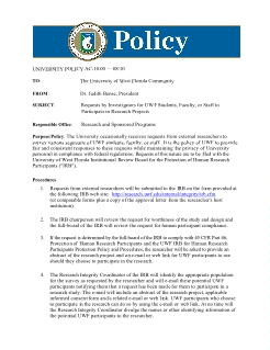 | Abstract | The University occasionally receives requests from external researchers to survey various segments of UWF students, faculty, or staff. It is the policy of UWF to provide fair and consistent responses to these requests while maintaining the privacy of University personnel in compliance with federal regulations. Requests of this nature are to be filed with the University of West Florida Institutional Review Board for the Protection of Human Research Participants ("IRB"). |