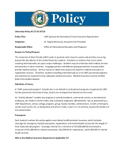 AbstractThe University of West Florida (UWF) seeks to promote safer travel to events and activities occurring beyond the boundaries of the United States by students. Accidents or sickness that occurs while traveling internationally can pose unique challenges. Students may be unfamiliar with medical services and locations in other countries. Language barriers and different billing procedures may also affect prompt medical services. Serious injuries or death may require the need for medical evacuation or repatriation services. Therefore, students travelling internationally on or to UWF-sponsored programs and activities are required to have adequate medical insurance. Medical insurance must be verified before the student departs.