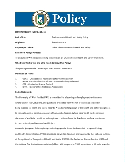 Articulate UWF Policy concerning adoption of Environmental Health and Safety Standards.