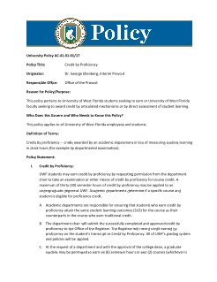 | Abstract | This policy pertains to University of West Florida students seeking to earn or University of West Florida faculty seeking to award credit by articulated mechanisms or by direct assessment of student learning. This is a new policy that clarifies the requirements for adherence to and compliance with SACSCOC accreditation, the Department of Education, the Florida Board of Governors, and the University of West Florida regulations, policies, and standards when earning or awarding credit by proficiency. |