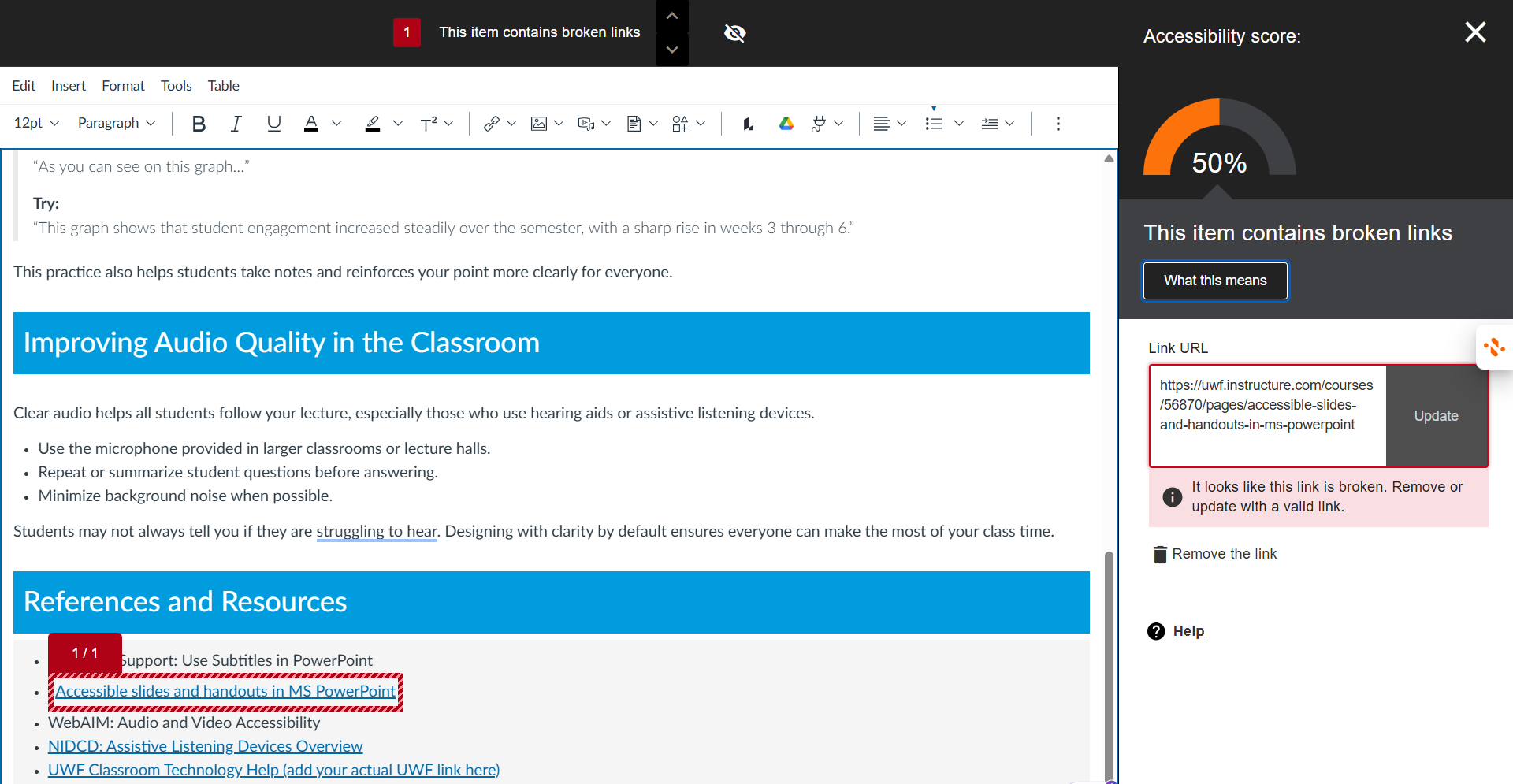 The goal isn’t to chase a perfect Ally score. The real priority is making sure students can access the resources you’ve shared. If students can reach the page, the warning can be safely ignored.