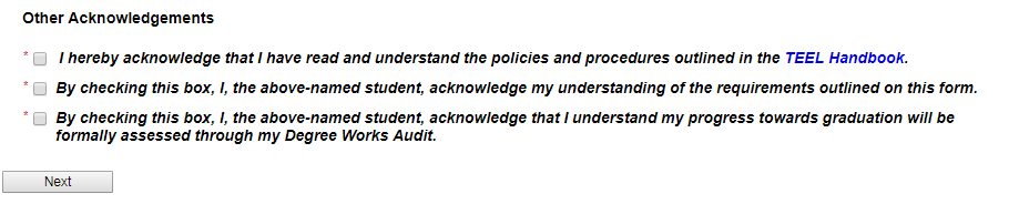 5. Read Other Acknowledgements, and check each box indicating your understanding. Once you have checked all of the boxes, please click Next.